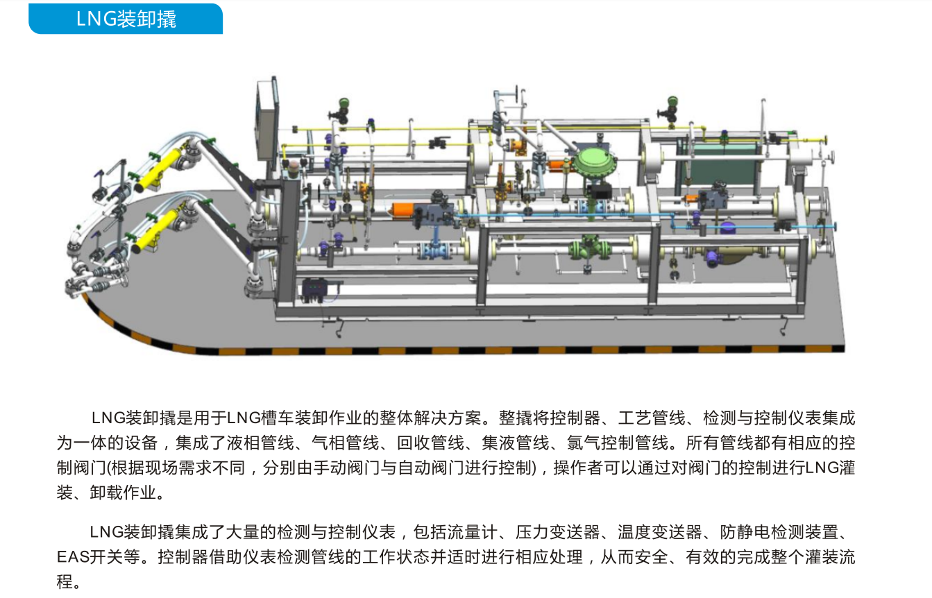 LNG裝卸撬是用于LNG槽車裝卸作業(yè)的整體解決方案。整撬將控制器、工藝管線、檢測與控制儀表集成為一體的設備,集成了液相管線、氣相管線、集液管線、放空管線、氮氣管線、儀表風管線、取液管線、增壓管線。